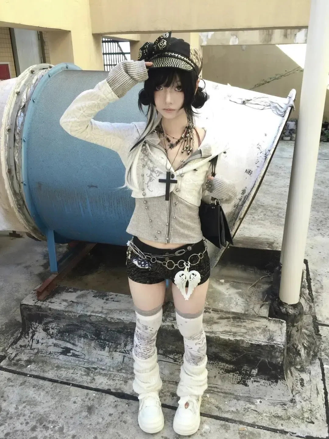 Der Grunge Y2K-Cardigan mit Kapuze Strassdetails kombiniert feminine Details mit einem edgy Touch – perfekt für Y2K- oder Grunge-inspirierte Outfits. Der cropped Schnitt, die Lagenoptik und die glänzenden Strassdetails machen ihn zu einem echten Highlight.
