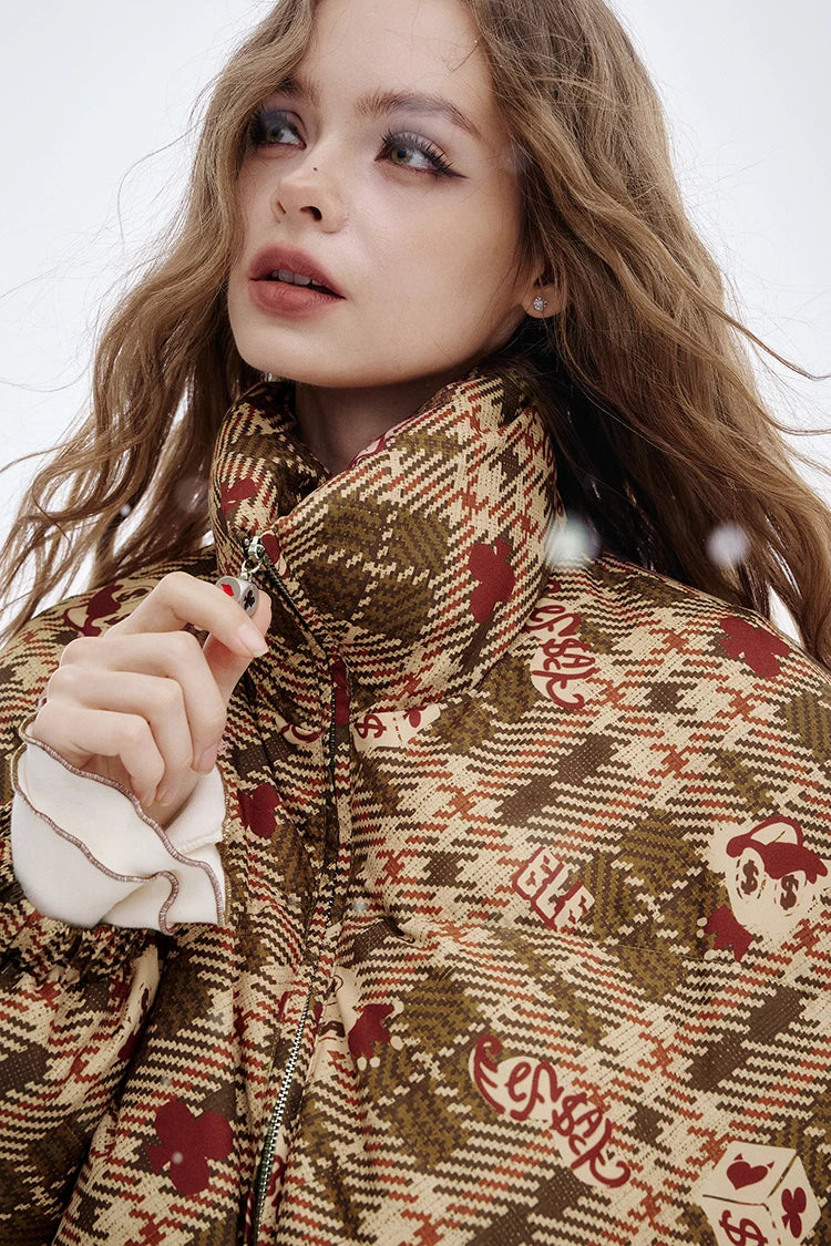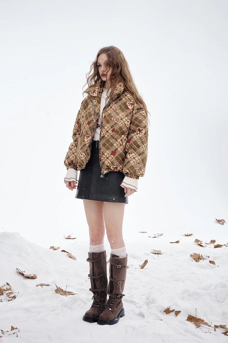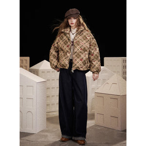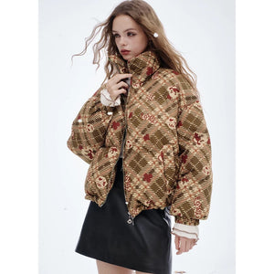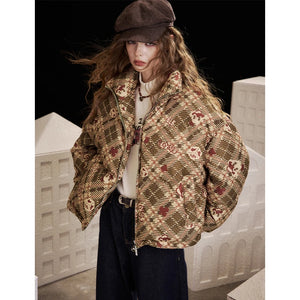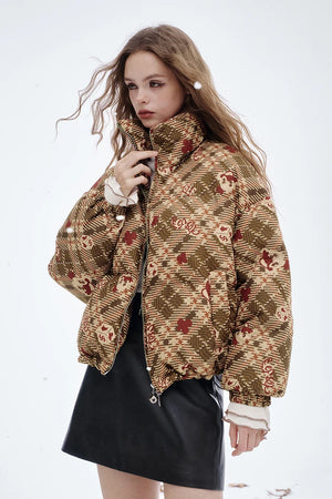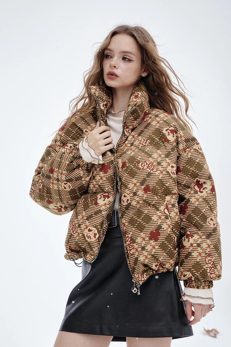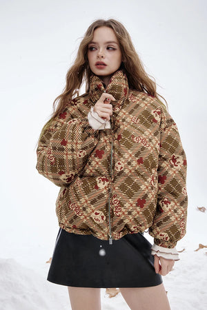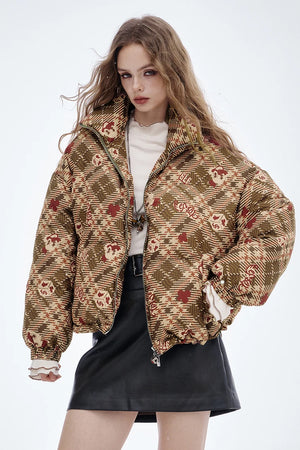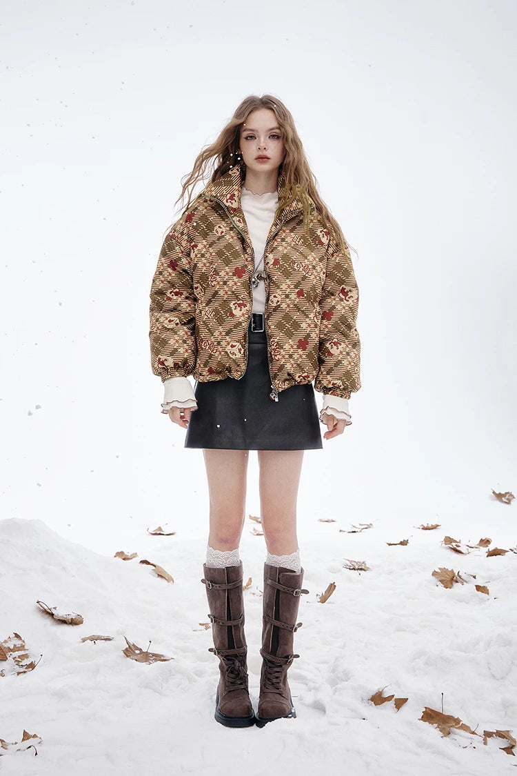 This vintage-inspired reversible puffer jacket is designed to bring character and warmth to winter outfits. Its short, loose silhouette creates a relaxed look while maintaining a strong visual presence.