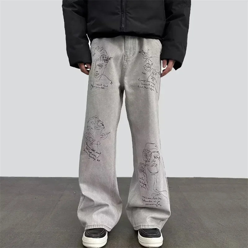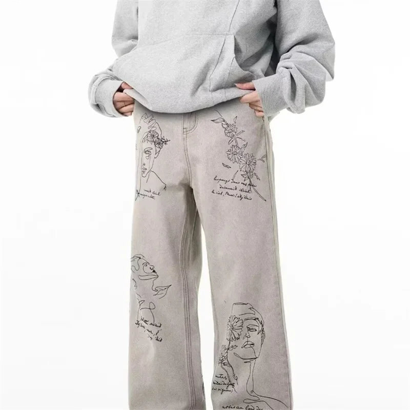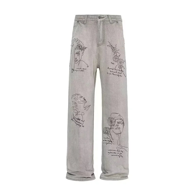 With their relaxed cut and graphic detailing, these jeans are a staple piece that fits into any wardrobe. Whether worn with a hoodie for a casual day out or layered with different textures for an expressive look, they blend seamlessly into your collection.