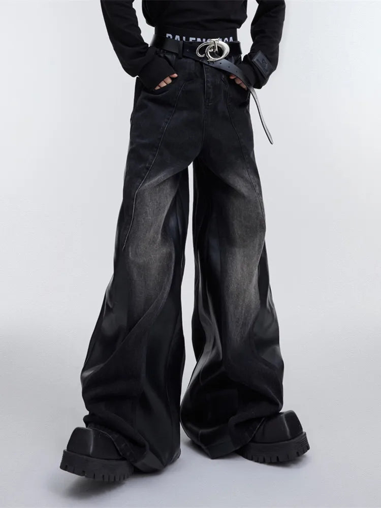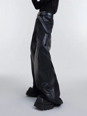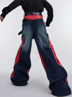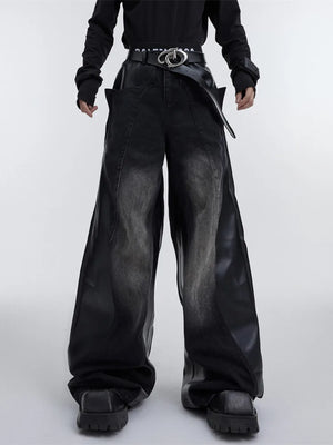 Y2K Pu Leather Patchwork Wide Leg Baggy Jeans