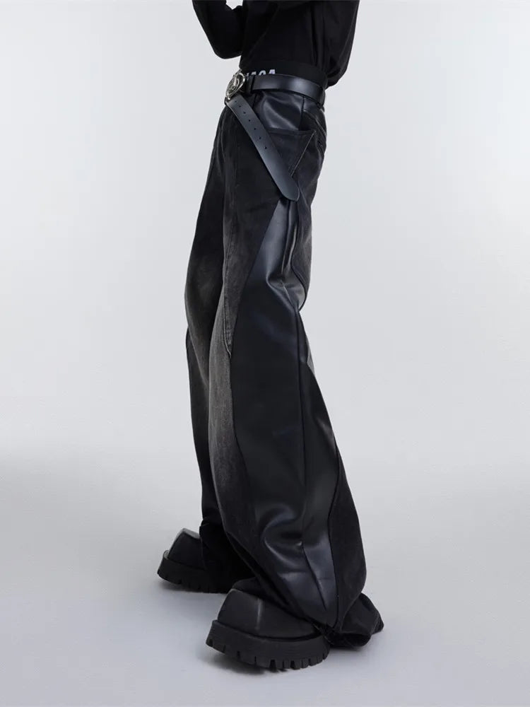 Designed for both mens and womens fashion, these jeans feature a statement patchwork construction with PU leather panels running down the legs, creating a contrast against the denim. The wide-leg silhouette improves their relaxed fit, while the combination of materials gives them a standout, futuristic cyber appeal.