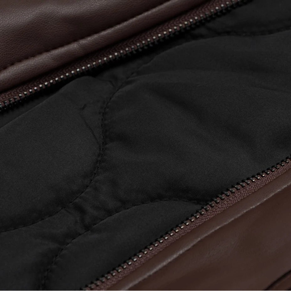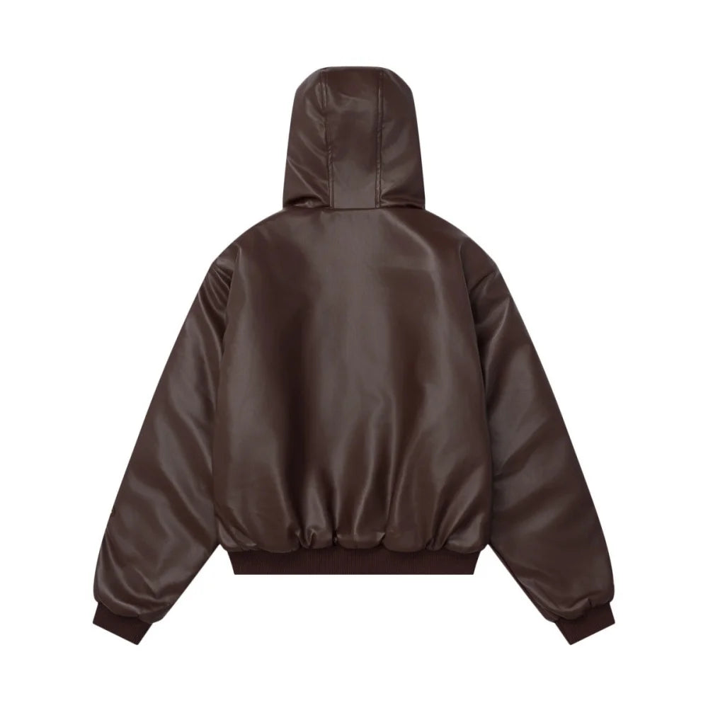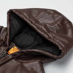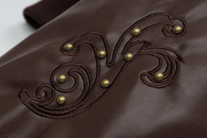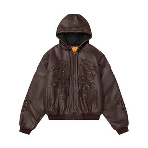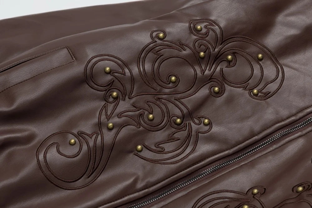 The Y2K Embroidered Quilted PU Leather Hooded Jacket blends early 2000s aesthetics with a bold, structured silhouette. Its rich brown PU leather finish is elevated by intricate embroidery and metal rivet details, creating a statement outerwear piece.