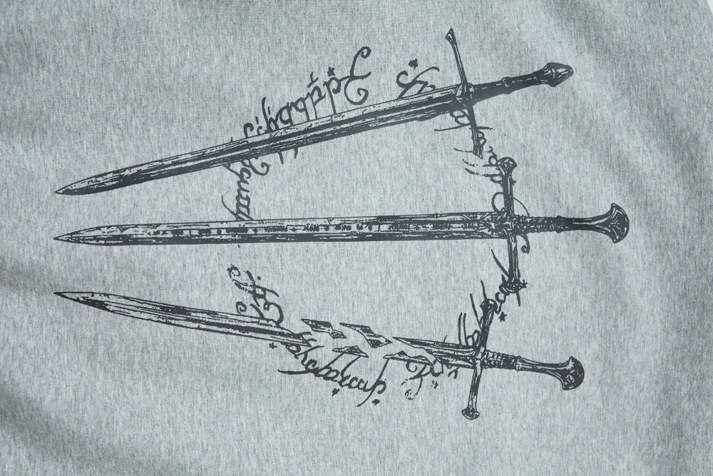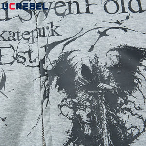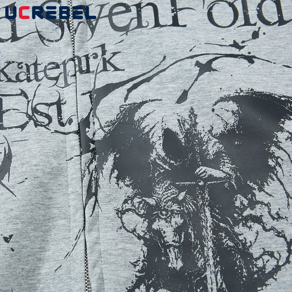 This Y2K Grim Reaper jacket channels early-2000s dark streetwear with a raw, underground aesthetic. The front features a distressed grim reaper graphic paired with layered typography, while the back reveals a bold sword-inspired print that reinforces its rebellious edge.