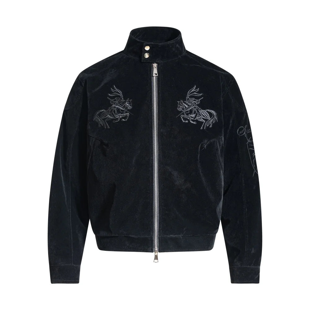 This zip-up jacket takes a clean high street silhouette and twists it with a medieval-inspired edge. Featuring detailed knight embroidery across the chest, it brings a dark, vintage vibe without going full costume.