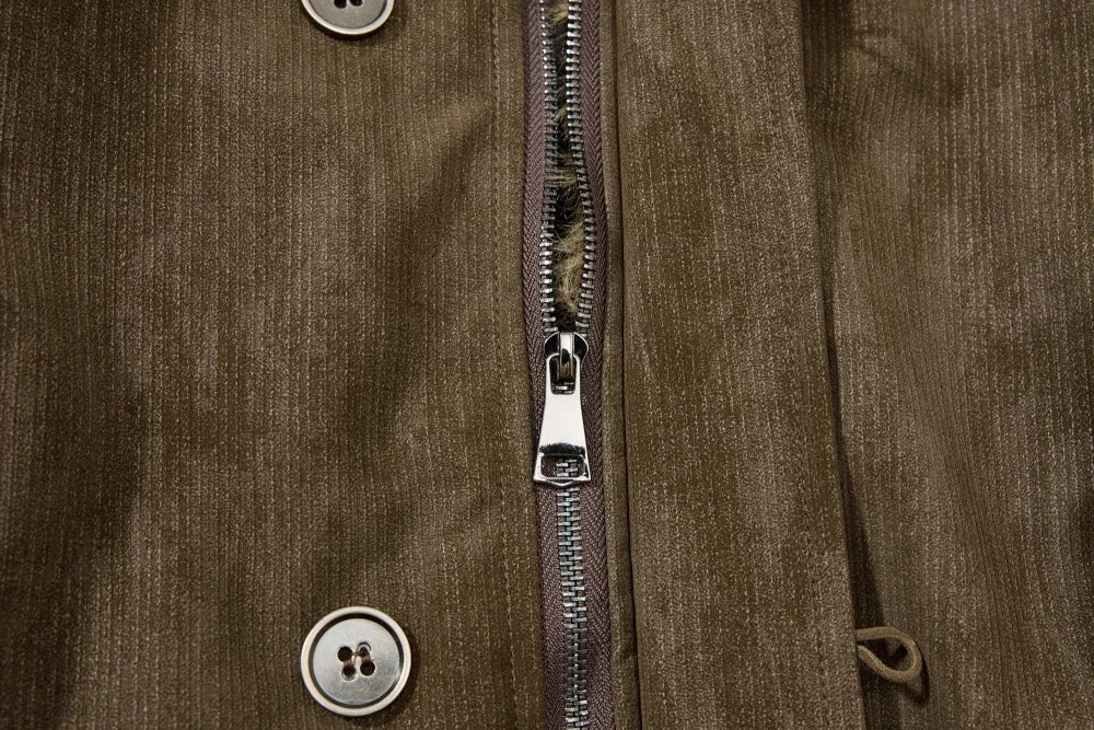 The textured outer fabric gives the jacket a worn-in, vintage look, while the ribbed cuffs and hem help maintain structure. Its loose fit makes it ideal for layering over hoodies or knitwear during colder days.