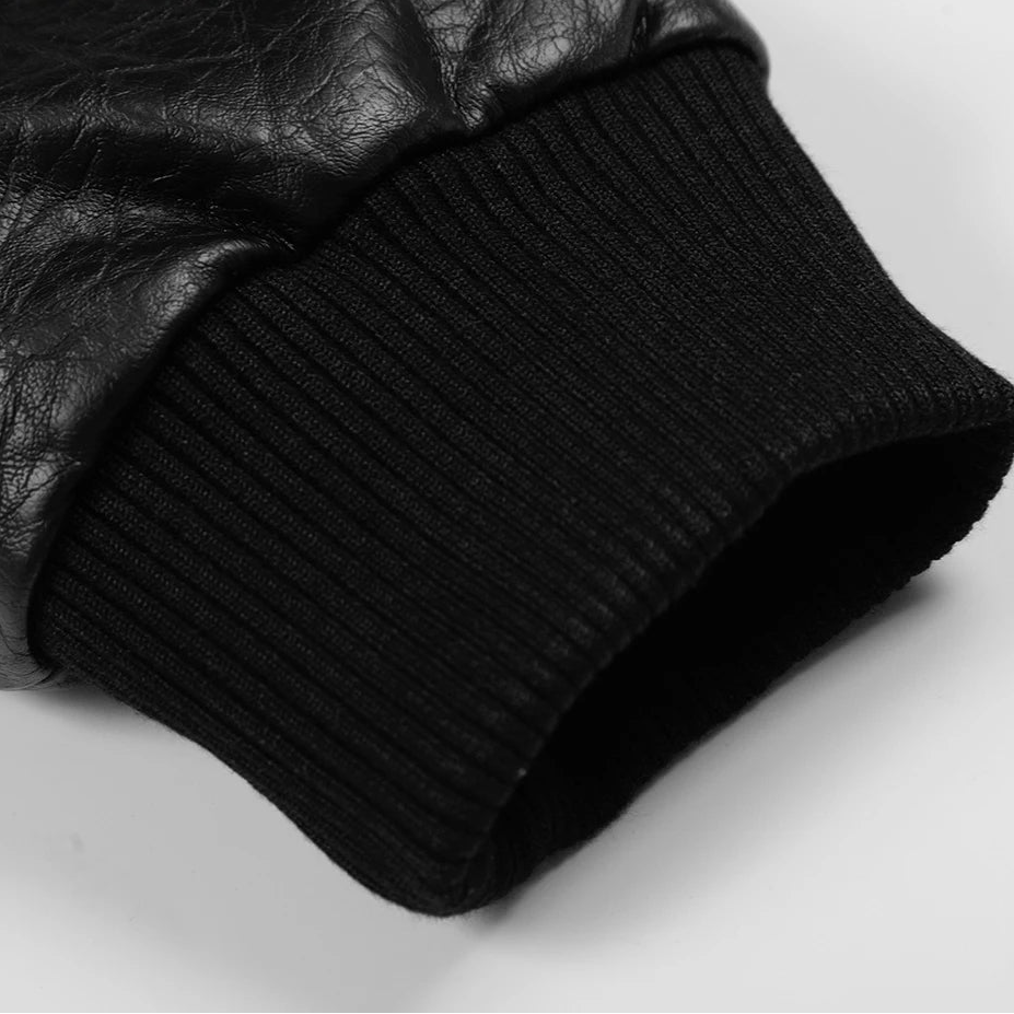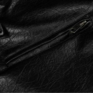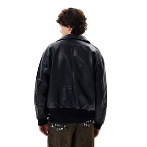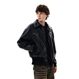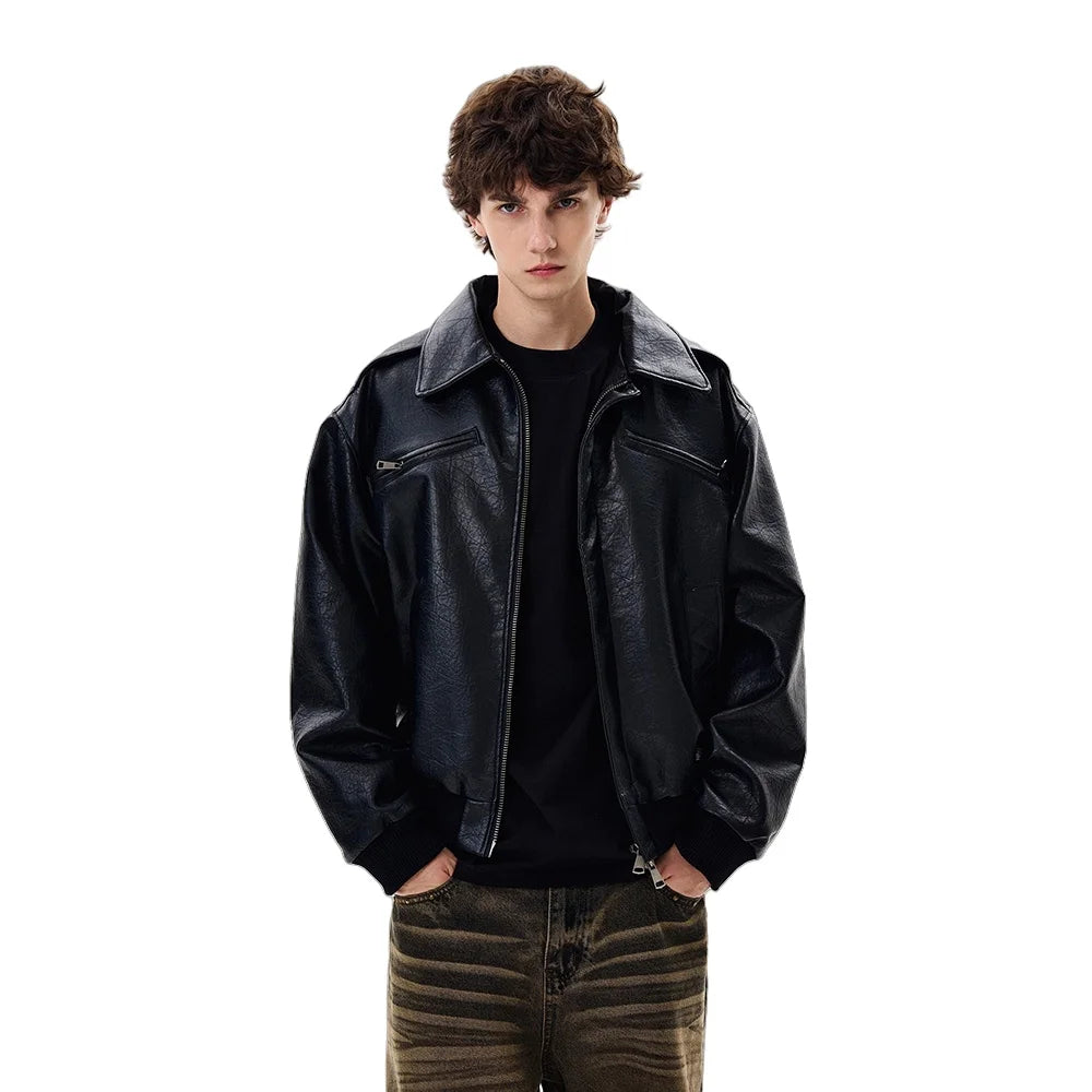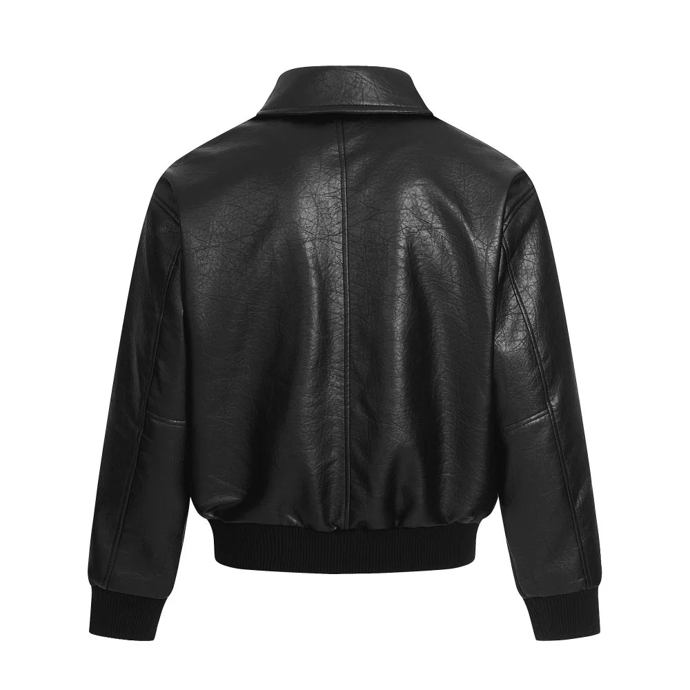 Crafted from smooth PU leather with a subtle texture, it features a classic turn-down collar, ribbed cuffs and hem, and functional zip pockets for a structured yet relaxed look. The slightly oversized cut makes it easy to layer, whether styled casually or as a statement outerwear piece.