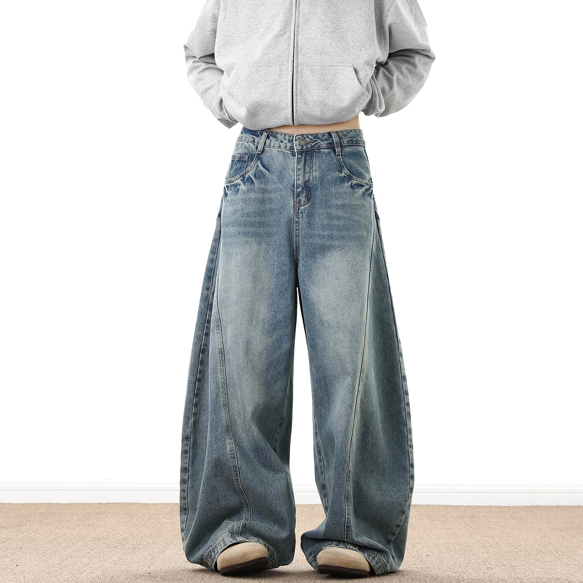 These baggy jeans pair well with a zip-up hoodie, creating an easy layered look that feels both casual and put together. The neutral denim wash makes them simple to coordinate with accessories like a belt or a beanie in complementing tones for a balanced outfit. To ensure the right fit, opt for shoes that match the foot opening, allowing the jeans to drape naturally for the perfect finish.