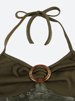 The Fairy Grunge Floral Halter Neck Top combines edgy style with a soft floral pattern and unique asymmetrical hem. Featuring a halter neckline with an O-ring accent, this top is ideal for creating bold looks with a touch of grunge flair. Perfect for pairing with skirts or high-waisted pants.