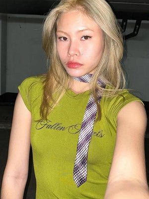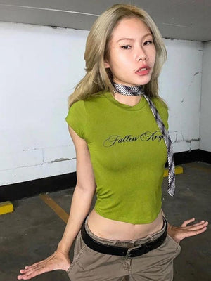 A little edgy, a little rebellious—this fitted crop tee says it all. With “Fallen Angels” script across the chest and a sleek silhouette, it’s giving Y2K brat energy in the coolest way. Pair it with cargo pants, low-rise skirts, or layered chains for the full aesthetic.