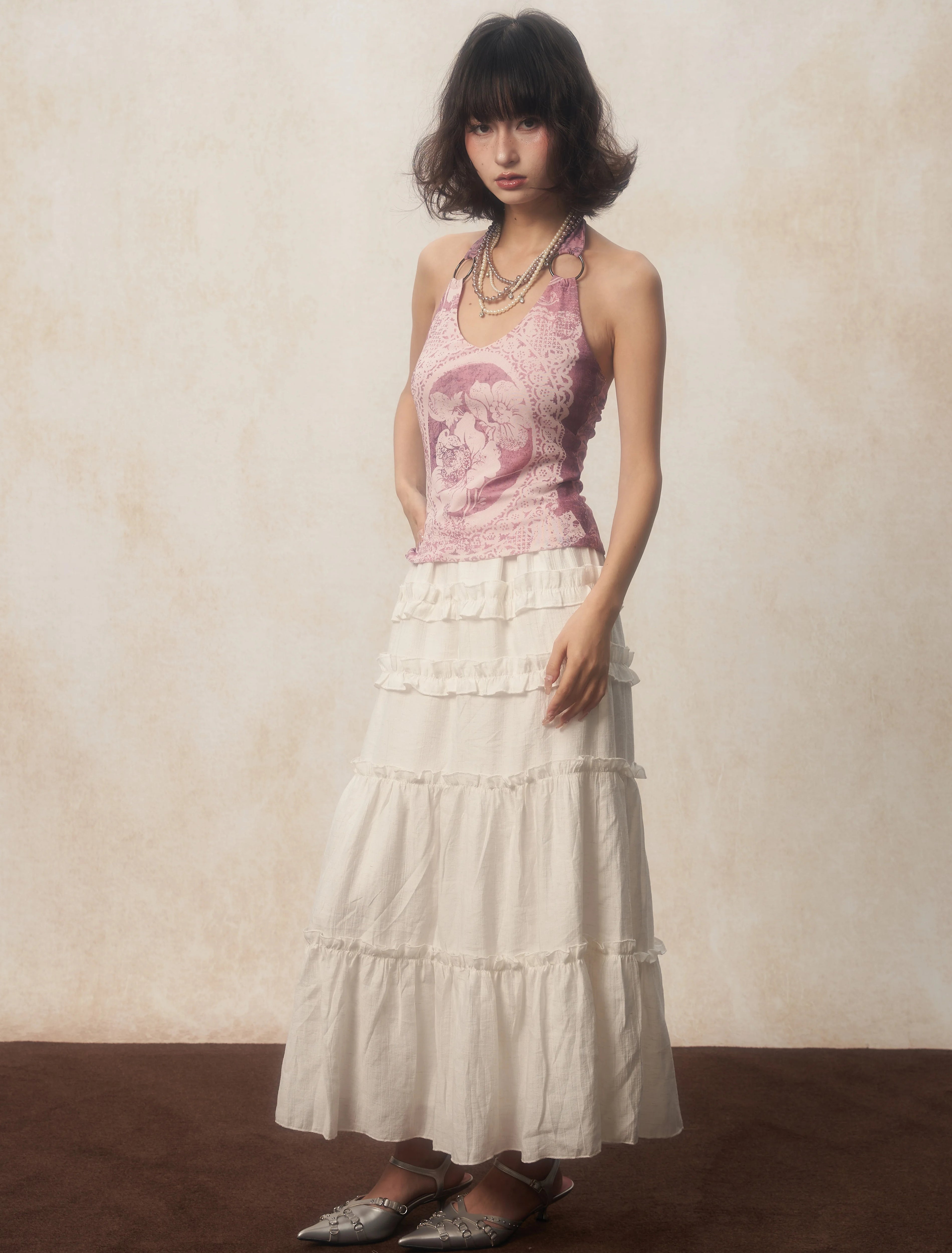 This rose halter top embodies romantic charm with its soft pink hues and intricate floral print. The lightweight fabric and stylish halter rings make it a versatile pick for summer or casual outings.