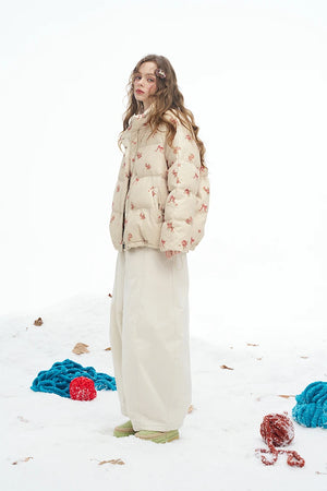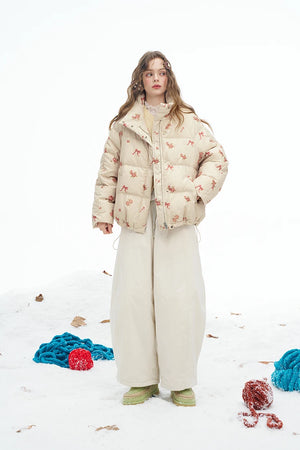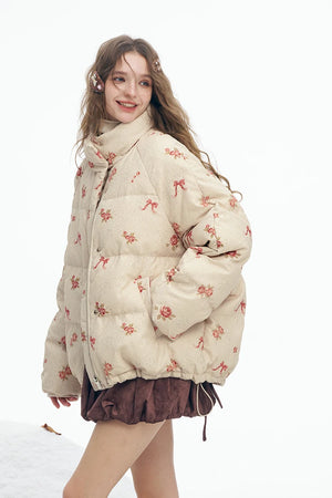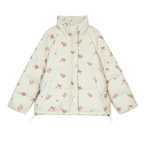 Y2K Bow Print Puffer Jacket with Stand Collar
