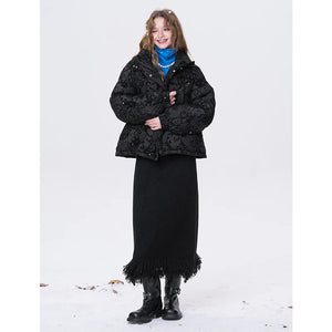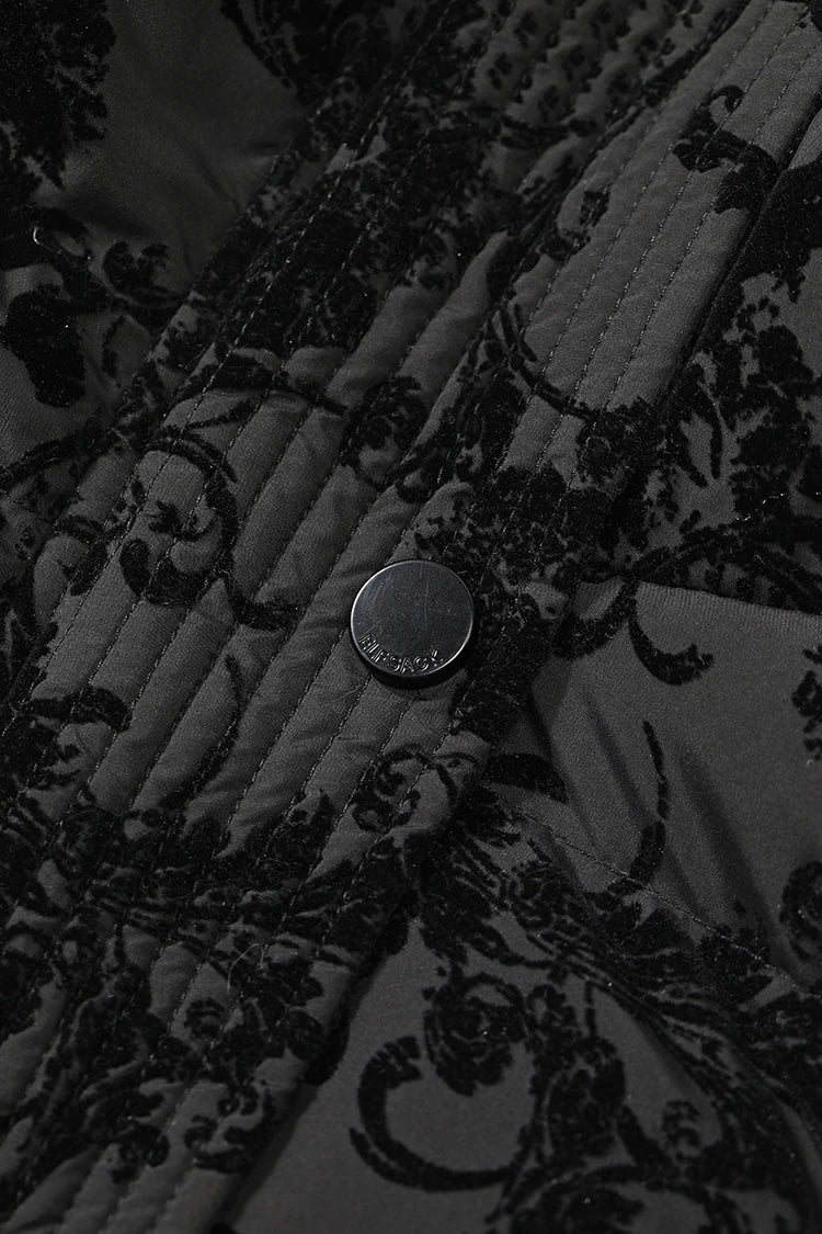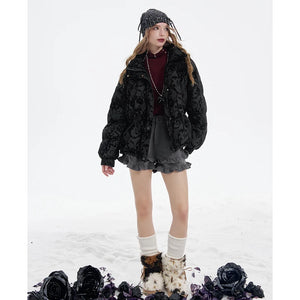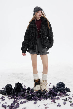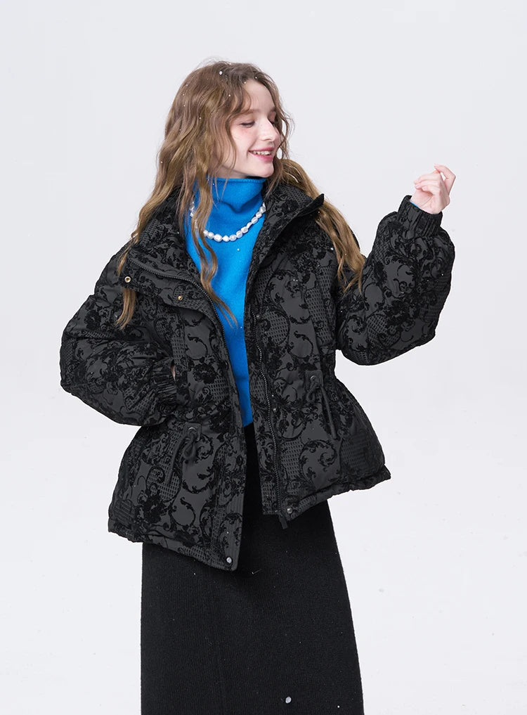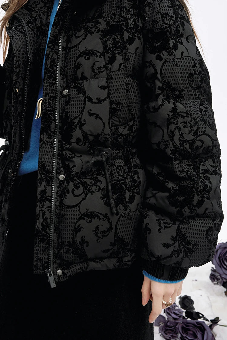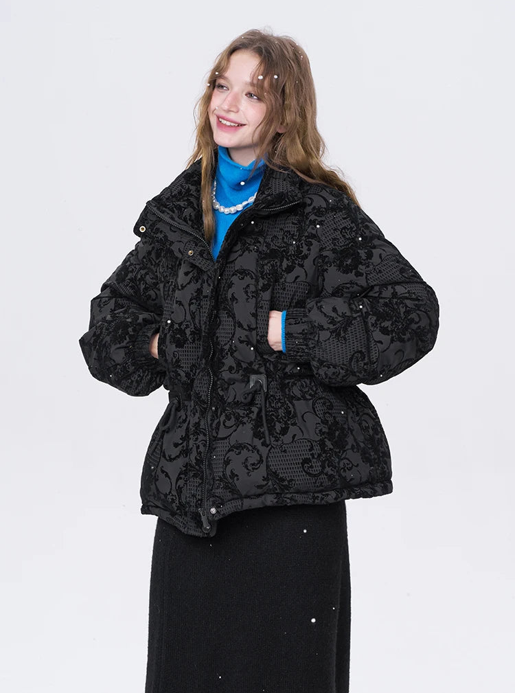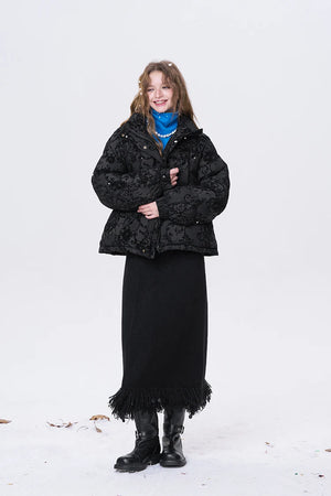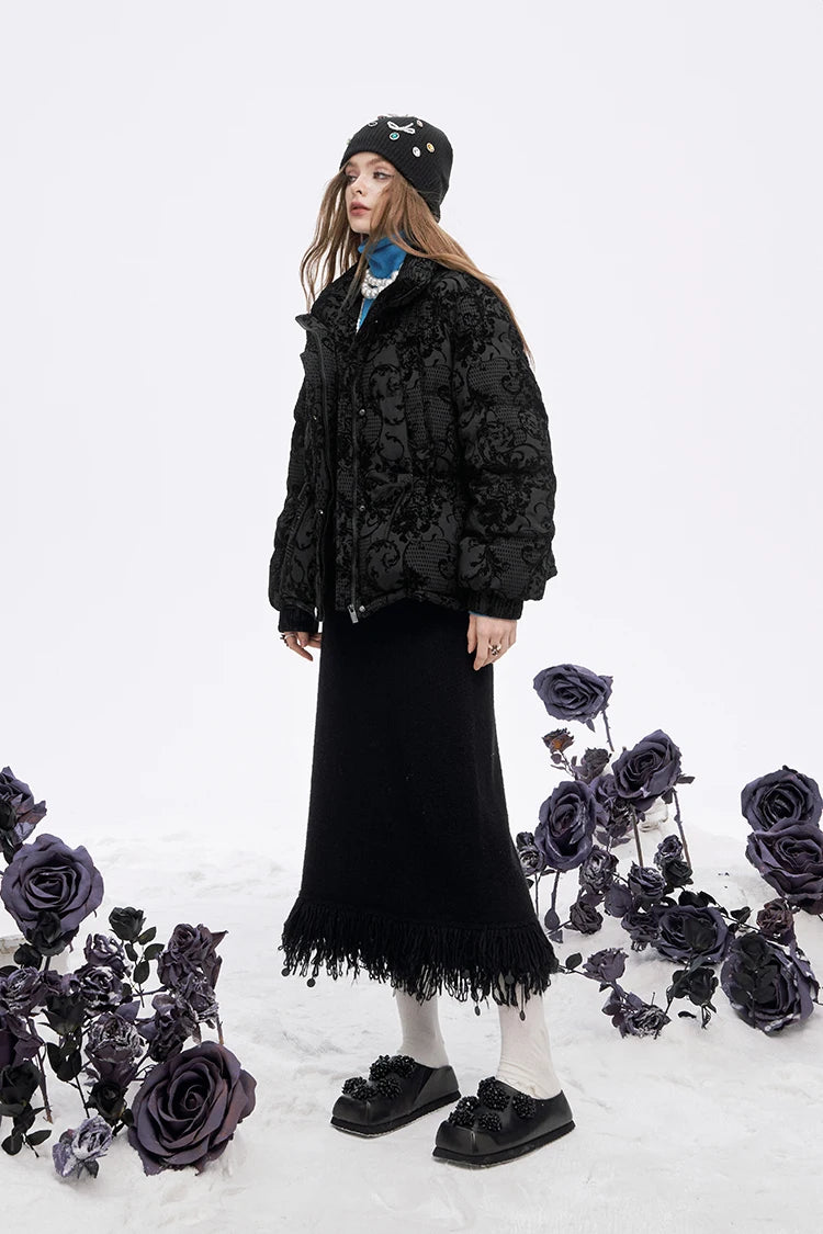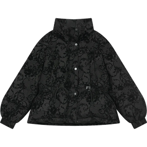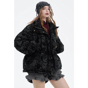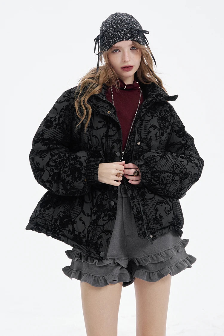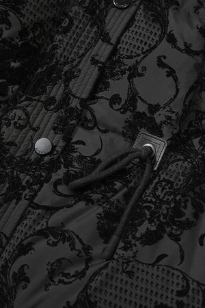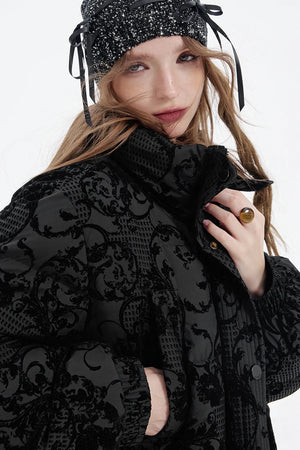 This long puffer jacket stands out with its rich jacquard-style texture and a bold gothic-inspired aesthetic. Designed to make a statement, it blends vintage influences with a modern Y2K edge.