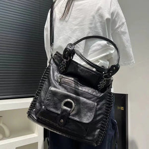 Ce sac noir au style Y2K vintage est l’accessoire parfait pour compléter un look rétro et tendance. Sa texture souple façon cuir et son anneau métallique en font une pièce pratique et stylée pour le quotidien.