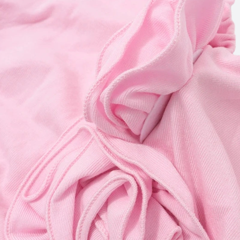 The Soft Girl Floral Halter Top features a dusty pink jersey fabric ruched at the sides with a V-neck halter tie. Two dimensional floral rosette appliqués decorate the bust adding soft visual texture. The fabric offers gentle stretch for a fitted torso and ease of movement. Ideal for casual or romantic looks styled with skirts or high-waisted bottoms.
